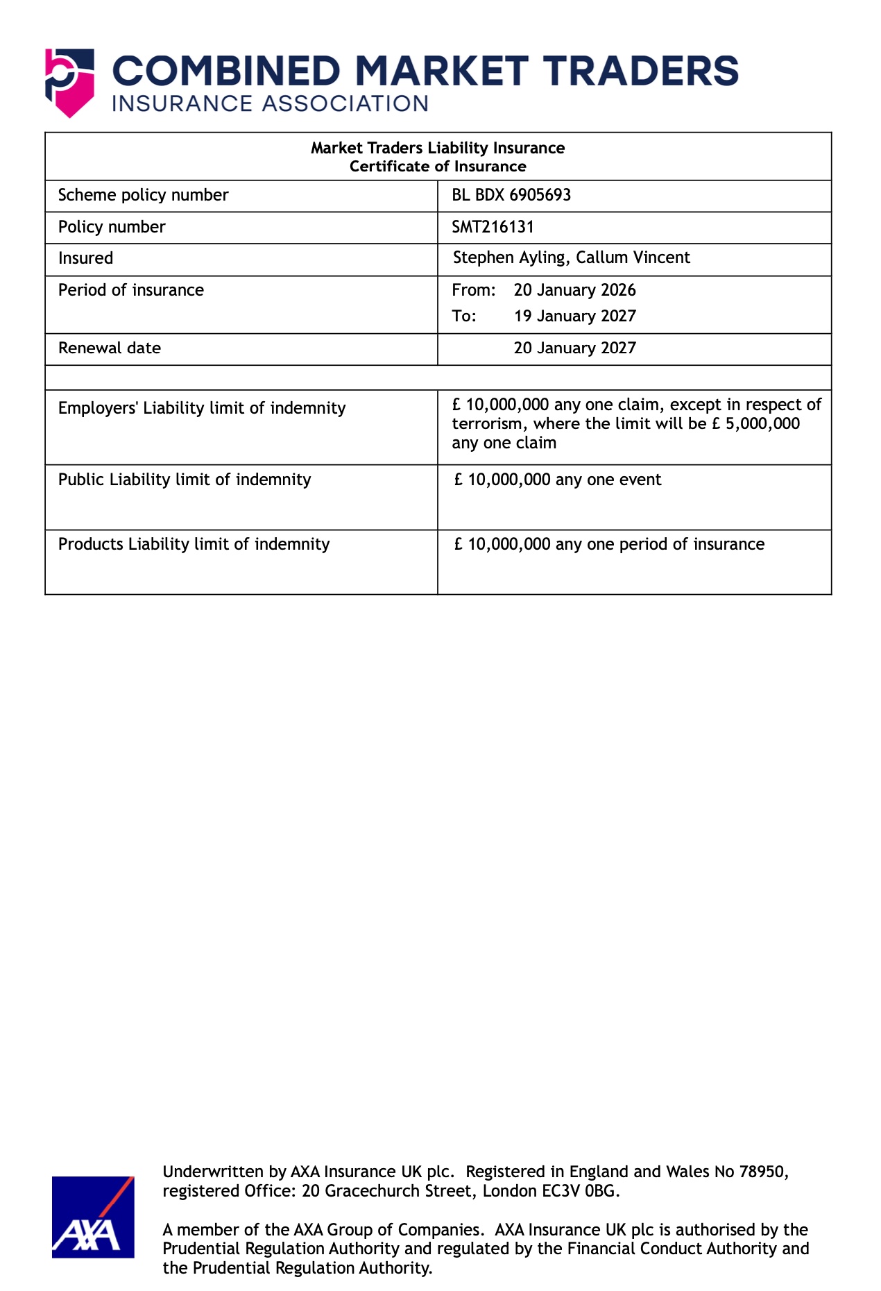 here you can view or download a copy of our Public Liability Insurance certificate (£10m)
