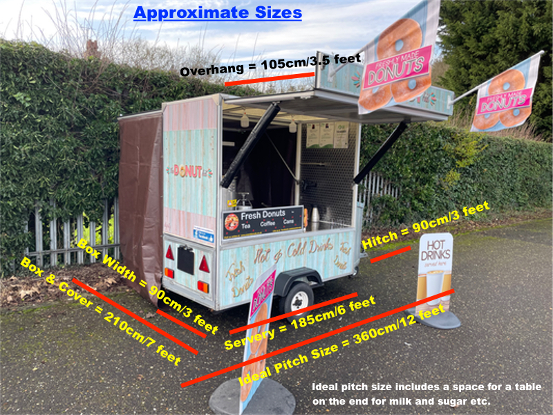 On the left is a picture with the approximate sizes of the trailer. The back covered area (Brown) is where we stand to cook. The ideal 12 foot wide pitch includes space for a small table where customers can put milk and sugar in their hot drinks and a bin.